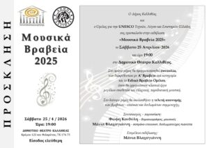 Ο Όμιλος για την UNESCO Τεχνών, Λόγου & Επιστημών Ελλάδος και ο Δήμος Καλλιθέας σας προσκαλούν το Σάββατο 25 Απριλίου 2026 και ώρα 19.00 στην τελετή απονομής των βραβείων του 10ου Πανελλήνιου Διαγωνισμού Μουσικής 2025, για παιδιά και νέες – νέους μουσικούς 9 – 30 ετών. Η εκδήλωση φιλοξενείται στο Δημοτικό Θέατρο Καλλιθέας (Κρέμου 123 και Φιλαρέτου, Τ.Κ. 176 75).