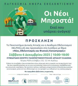 Με στόχο την ενημέρωση και ενεργοποίηση των νέων γύρω από ζητήματα κλιματικής κρίσης και φυσικών καταστροφών, η Ακαδημία Εθελοντισμού HelpHellas και το Πανεπιστήμιο Δυτικής Αττικής διοργανώνουν στις 6 Δεκεμβρίου ένα συνέδριο ανοιχτό στο κοινό, με επίκεντρο τον ρόλο της νέας γενιάς στον εθελοντισμό.
