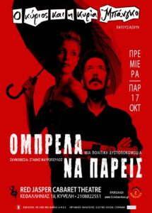 Σάτιρα, μαύρο χιούμορ, ύφος γκροτέσκο και σουρεαλισμός συνθέτουν τη μουσικοθεατρική παράσταση «Ομπρέλα να πάρεις», σε κείμενο Μαρίνας Αντωνοπούλου, μουσική και στίχους Γιώργου Χούχου και σκηνοθεσία Στάθη Μαυρόπουλου. Μια ιστορία για την ύβρη της εξουσίας και την ανάγκη για αέναη εξέγερση, θέμα παλιό όσο και η ανθρωπότητα κι επίκαιρο όσο κάθε νέο σκάνδαλο, κάθε ανατίμηση (προσεχώς ακόμη και στον αέρα που αναπνέουμε), κάθε είδηση που μας κάνει να πέφτουμε από τα σύννεφα. Η αφήγηση εκπληρώνεται τόσο μέσα από τον λόγο όσο και μέσα από τη μουσική. Η πρόζα μπλέκεται με τραγούδια που μπήγουν το μαχαίρι στο κόκαλο, χτίζοντας ένα θέατρο ευθύ και ροκ, αντίδοτο σε όσα μας θυμώνουν και μας φοβίζουν.