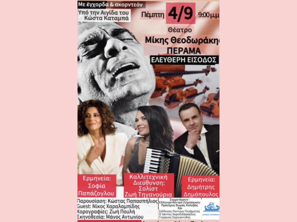 Καλλιτεχνική Διεύθυνση/Σολίστ Ακορντεόν: Ζωή Τηγανούρια Ερμηνεύουν: Σοφία Παπάζογλου & Δημήτρης Δημόπουλος Υπό την αιγίδα του Κώστα Καταμπά Παρουσίαση: Κώστας Παπασπήλιος Guest: Νίκος Χαραλαμπίδης Σκηνοθεσία/επιμέλεια φωτισμού: Μάνος Αντωνίου Πέμπτη 4 Σεπτεμβρίου 2025 Ανοιχτό Δημοτικό Θέατρο Δήμου Περάματος “Μίκης Θεοδωράκης” (Καρνέζη 1, Πέραμα 188 63) ώρα 21:00 ΕΙΣΟΔΟΣ ΕΛΕΥΘΕΡΗ Το μουσικό […]